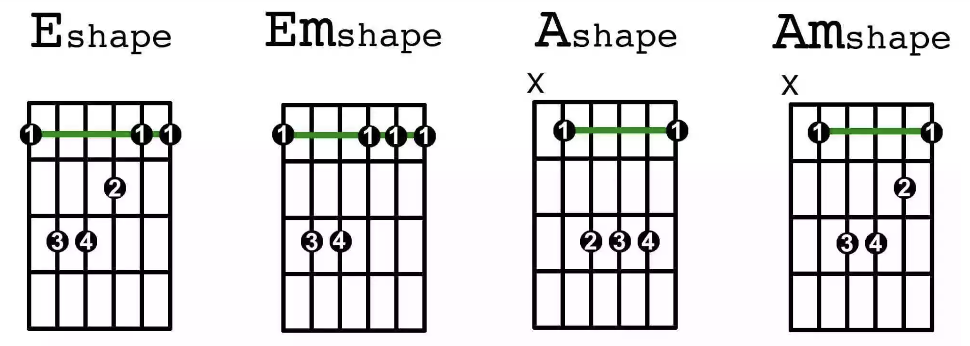 Take the E shape as an example. By turning it into a movable barre chord, you can play a variety of chords along the neck. Based on the open E major shape, your index finger acts as a barre, replacing the nut.